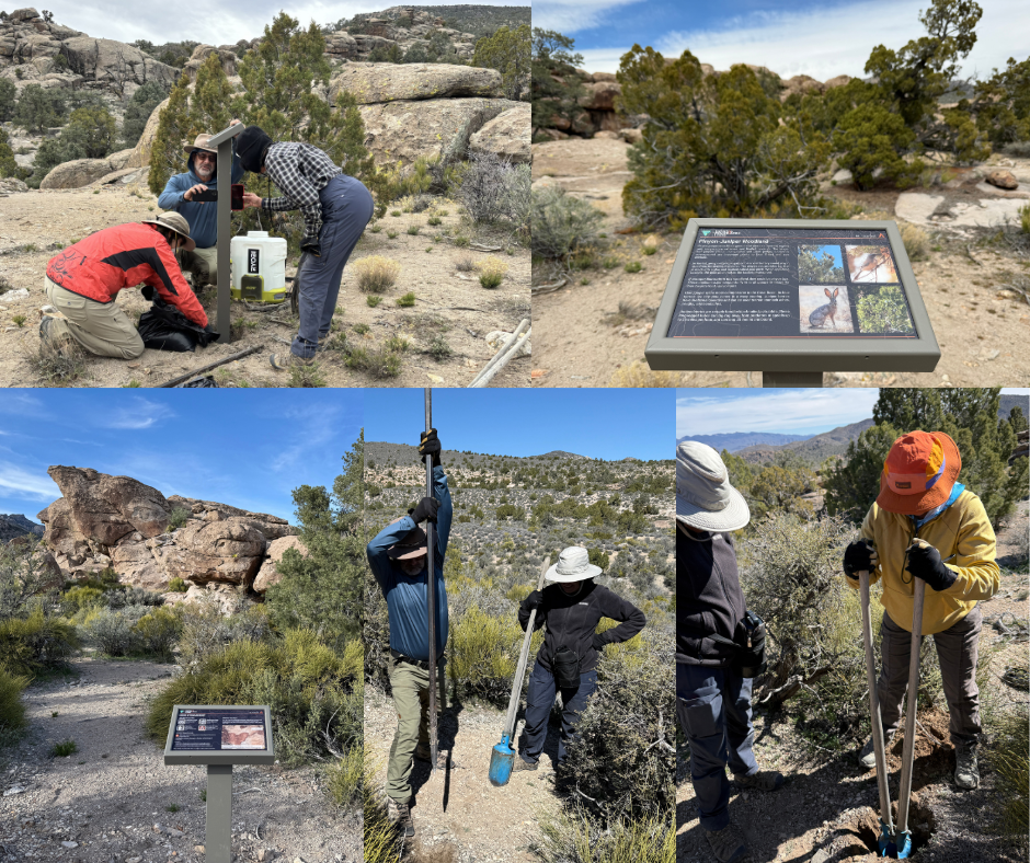 Saturday was the kind of day that tests both grit and teamwork. At Mount Irish Archaeological District, volunteers spent the entire day installing six interpretive signs along a 1.5-mile trail that winds through four distinct petroglyph sites. The trail begins and ends at the campground, but there was nothing easy about the work in between. Every post hole had to be dug by hand. Concrete had to be mixed and poured. Tools and materials had to be carried in on foot. It was physical, demanding labor—but no one backed down. By the end of the day, the trail had been transformed into a richer, more informative experience for future visitors.